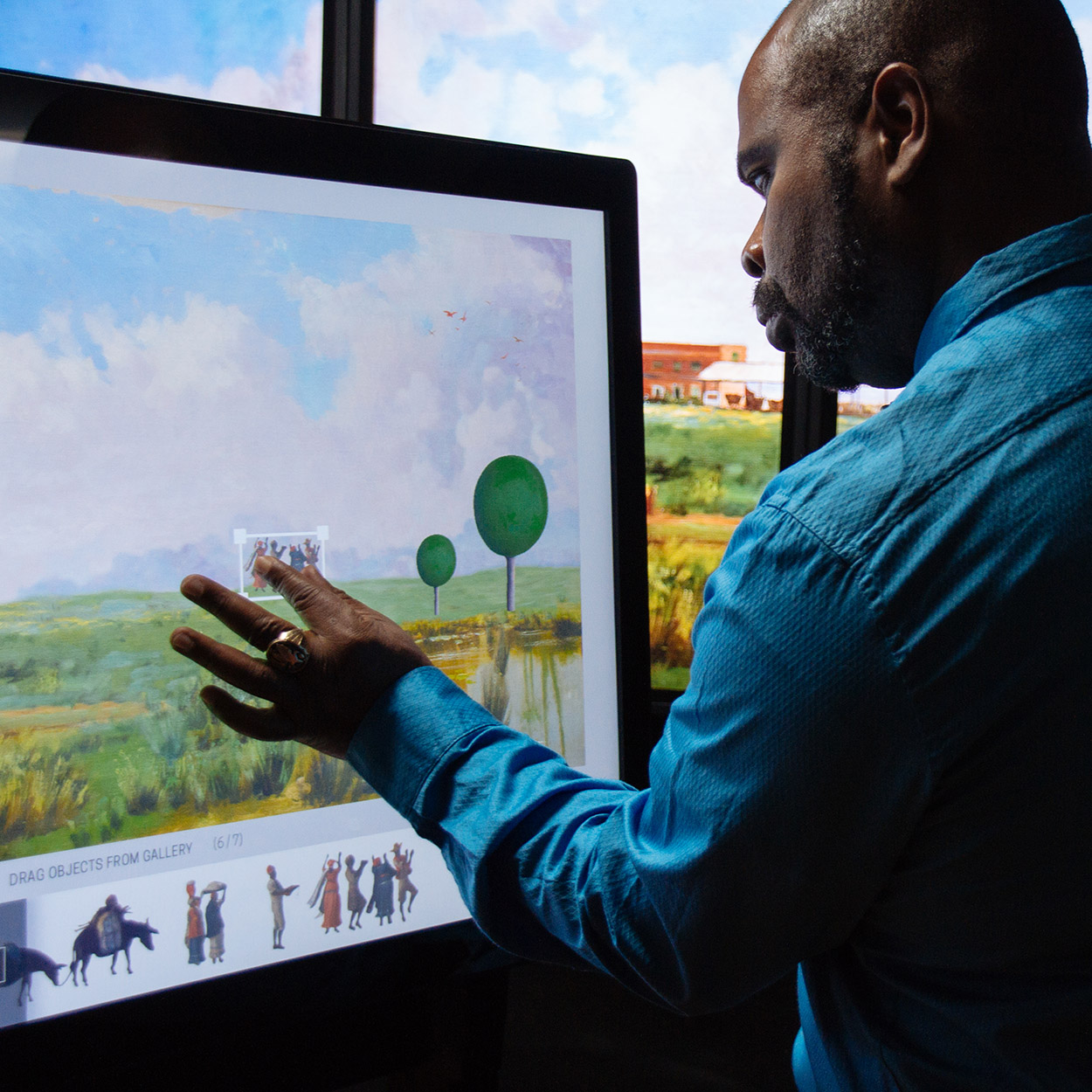 Landscapes Carry Meaning Published March 16, 2016 at 1250 × 1250 in GLAMi Nomination The user scales the image of the group of figures he has added to his landscape. A user engages with the multitouch wall interactive, Landscapes Carry Meaning. He scales the image of the group of figures he has added to his landscape.