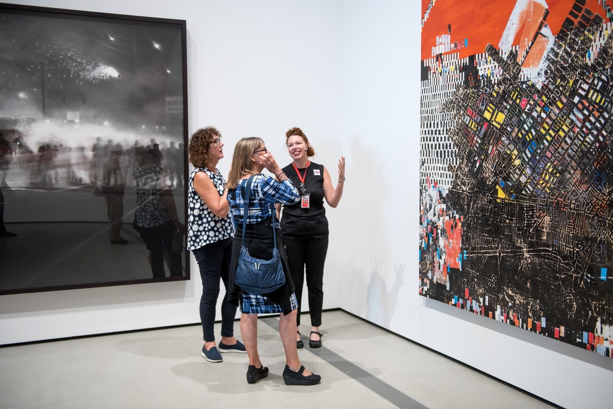 dsc_5839_ben-gibbs Published March 14, 2016 at 1200 × 801 in GLAMi Nomination Visitor Services Associate Sacha Baumann talks with two visitors about Mark Bradford’s 2006 work Scorched Earth.</em