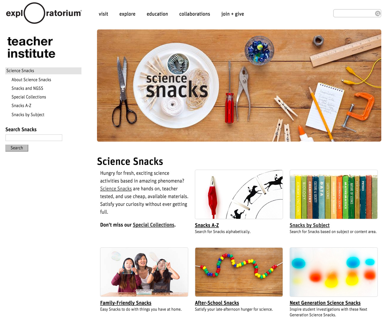 Science Snacks home page Published March 9, 2016 at 1250 × 1043 in GLAMi Nomination Home page for the Science Snacks website, showing different ways to browse and search for activities. Satisfy your curiosity without ever getting full. Science Snacks home page