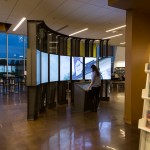 When guests arrive at the library, a curved steel wall with seven integrated screens uses digital and architectural elements to draw them into the space. An elegant motion piece plays on the exterior of the installation, using map-inspired graphics to illustrate the county’s evolution over time.