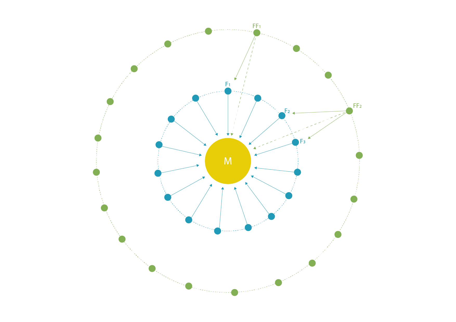 Blue dots represent museum followers, and dots in green some of their followers. The dashed arrows represent connections that may be created through triadic closure. There is a two-step path from the museum to FF1, but there are two of such paths leading to FF2. Is there a higher probability FF2 will follow the museum? This is a question we shall try to answer.